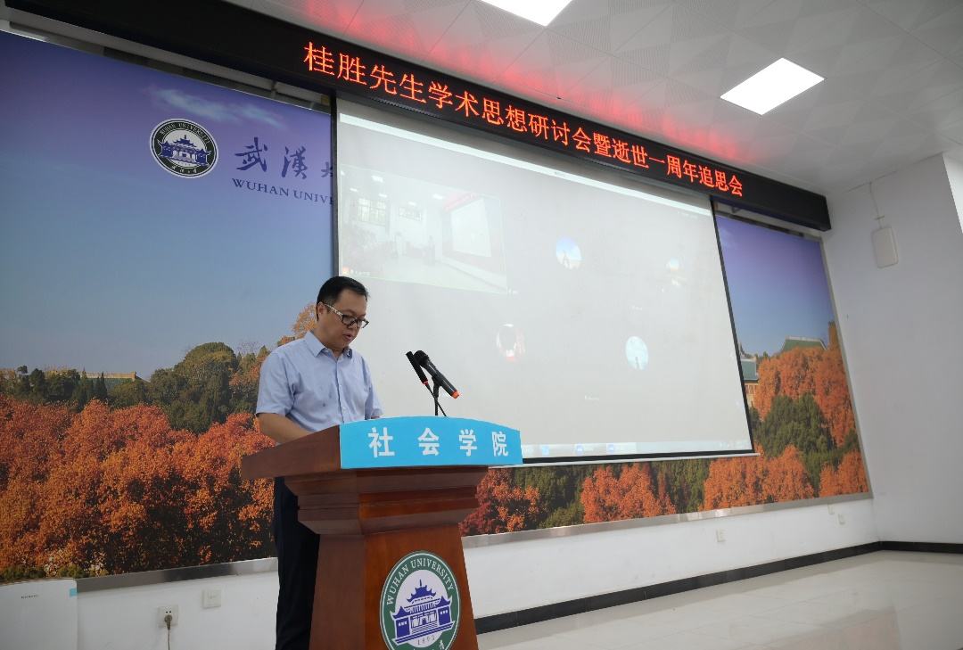 社会学系主任、中国社会学会副秘书长、社会思想史专业委员会秘书长宣朝庆教授回顾了桂胜先生的学术经历,肯定了桂胜先生提出的“缘”“势”“活法”等概念的理论张力,他忆及与桂胜先生一起在珞珈山的漫步,感慨珞珈山下的月光和草木或许还记得二人的笑声。他认为桂胜先生一生践行“知行合一”,具有严于律己、高风亮节、厚德载物的高尚品质。
