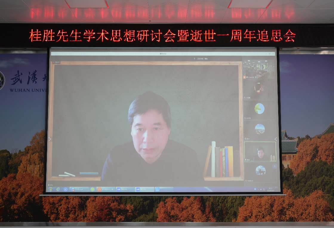 原院长田毅鹏教授通过线上参会,表达了对桂胜先生的哀思。他谈及与桂胜先生相识于1999年,经过多次会议交流,感受到桂胜先生具有较强的组织能力、扎实的学术功底和深厚的湖北情结。此外,他还总结了桂胜先生在先秦诸子研究、马工程重点教材《中国社会思想史》编写、民俗学研究以及中国社会思想史专业委员会建设方面的贡献。