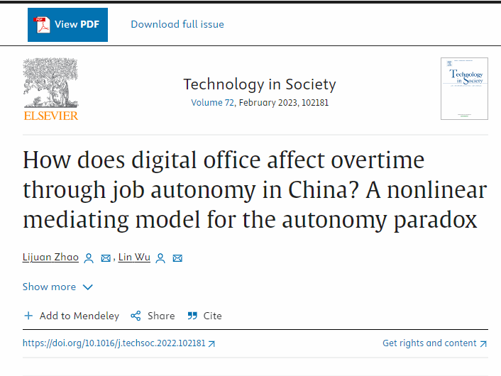 “How Does Digital Office Affect Overtime Through Job Autonomy in China? A Nonlinear Mediating Model for the Autonomy Paradox” 2023年3月发表于“technology in society”(通讯作者),杏吧原创