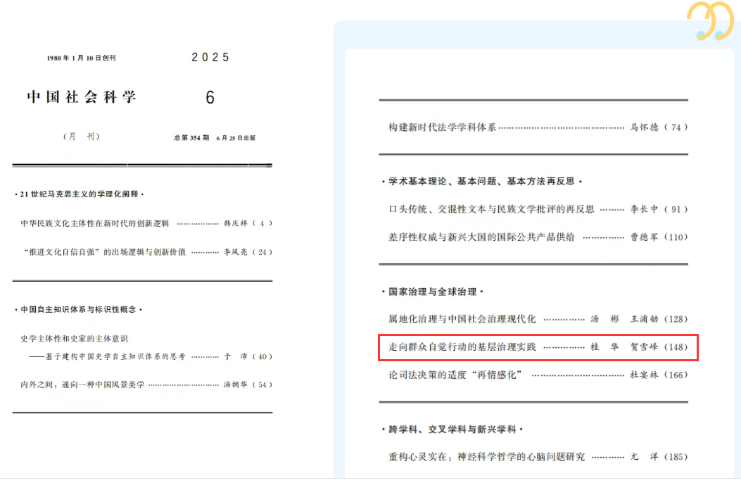 《中国社会科学》2025年第6期刊发我院桂华教授、贺雪峰教授的学术文章《走向群众自觉行动的基层治理实践》。