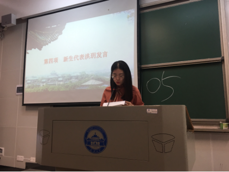 2018级硕士研究生洪玥同学作为新生代表发言,她代表全体新生表示,接下来要好好把握住宝贵的学习时间,她认为现在的焦虑不可怕,可怕的是中年焦虑,要做一个不给自己设限的人,在有限的研究生学习生涯中生猛成长。
