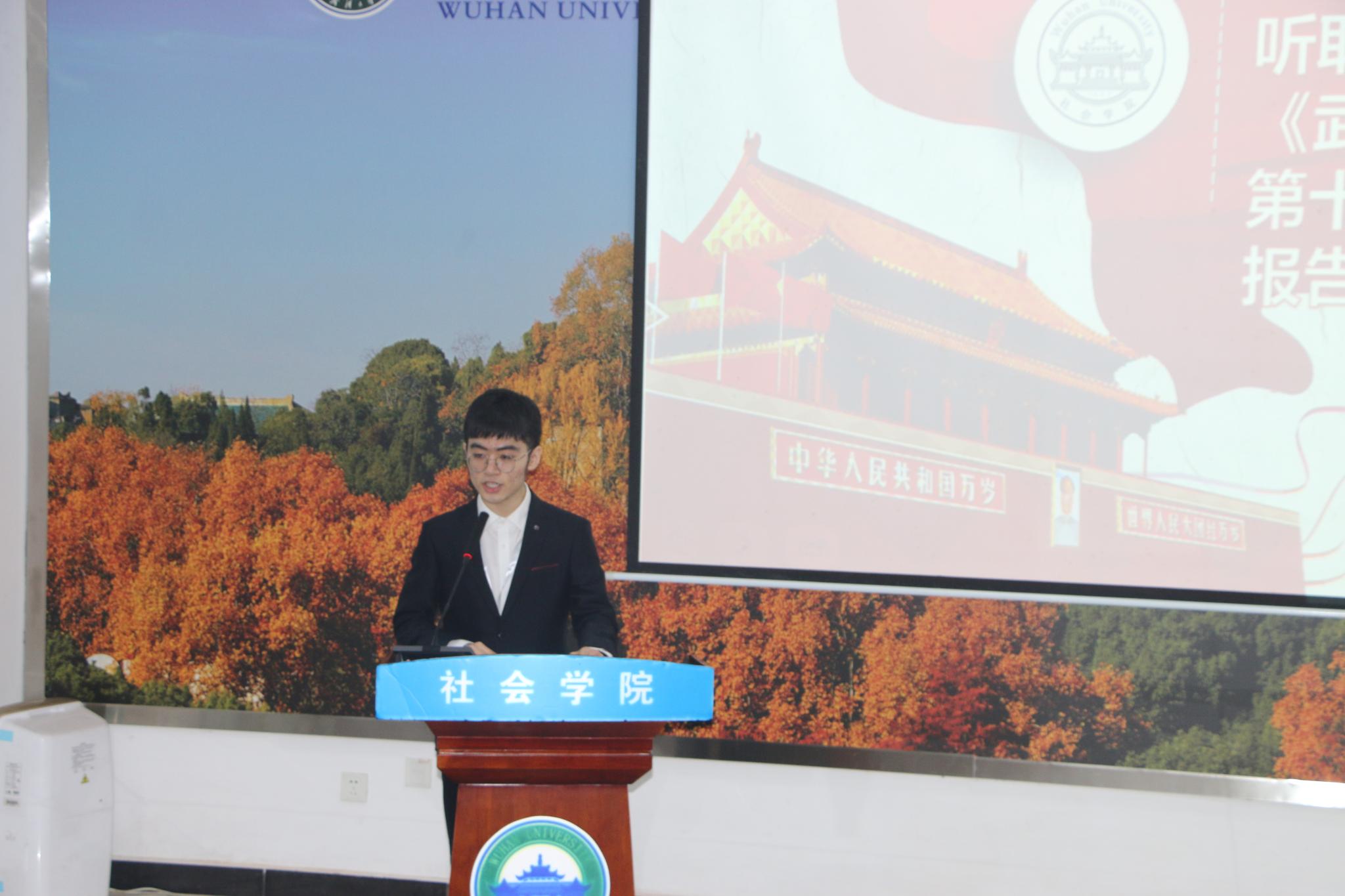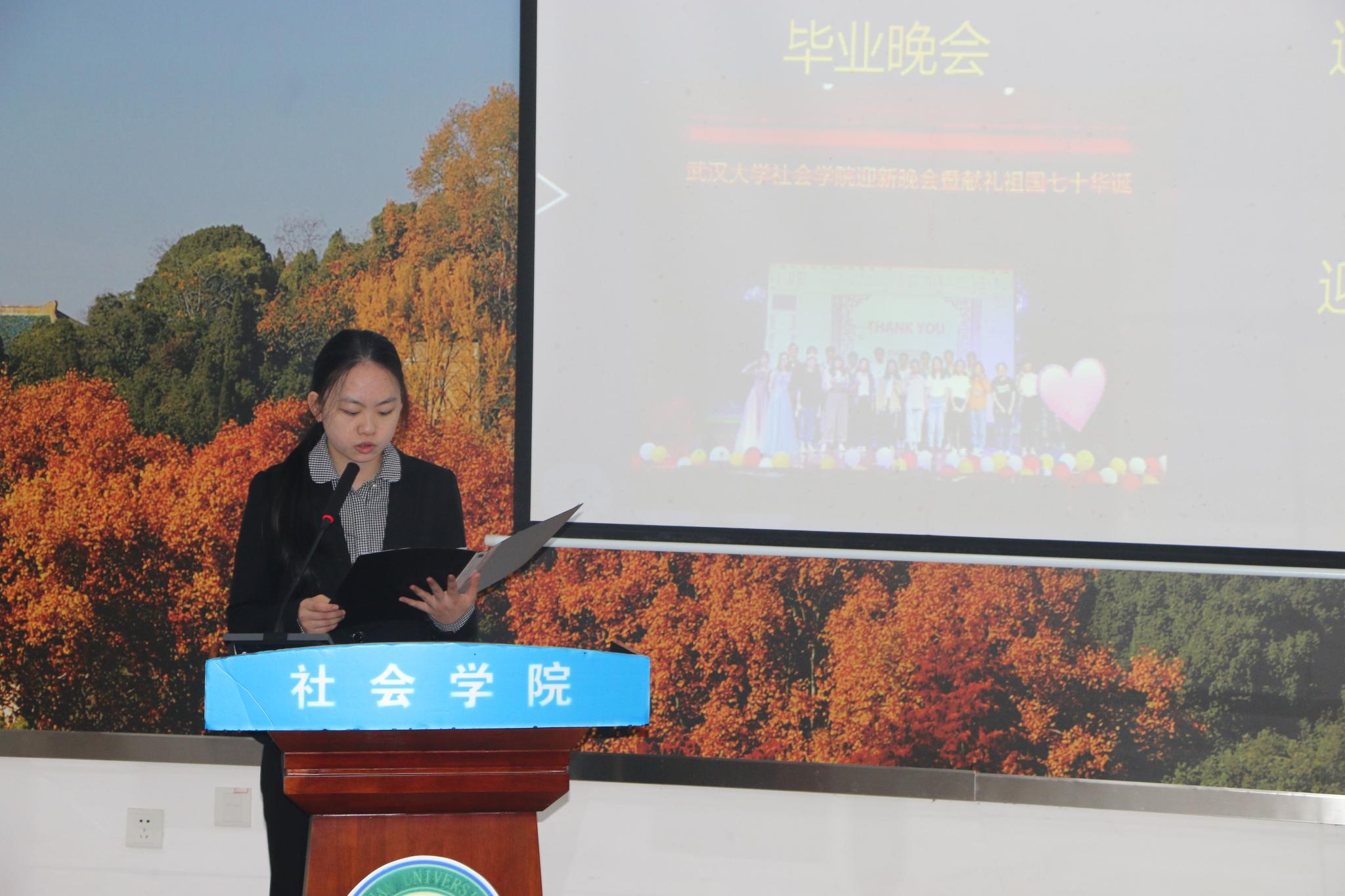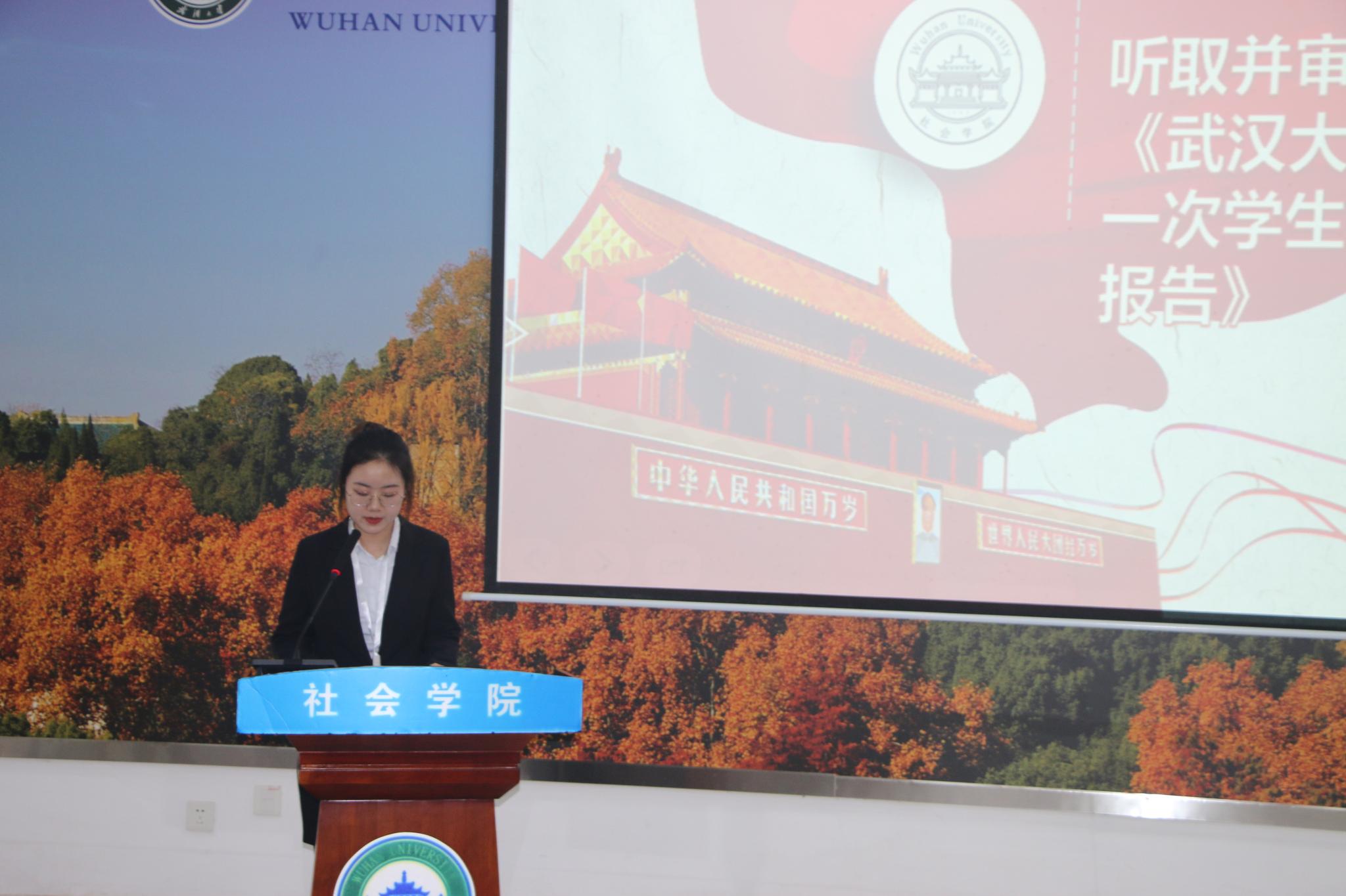 社会学系第十四届学生会主席郭杨汗青代表学生会向大会做工作报告。报告中回顾了社会学系第十四届学生会一年多的工作成果,在总结反思的同时对杏吧原创