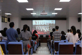 学子共同欢度国庆。十点整,随着军乐团的演奏,庆祝中华人民共和国成立70周年大会隆重开始。大屏幕上,国家主席习近平发表重要讲话,56门礼炮也发出了70响轰鸣,报告厅里响起了热烈的掌声。随后,国歌奏响,庄严神圣,全体同学及老师起立,唱响国歌。当大屏幕上习近平主席驶过长安街,受阅部队正式开始接受检阅。