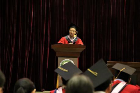 接下来,在学子们热烈的掌声中,2013级本科生班导、教师代表陈昫上台致辞。陈昫老师在回顾与本科毕业生四年相处的情境时,感慨时光飞快,转眼就到了要说再见的时候,他真诚地祝愿各位毕业学子们能够在社会上发挥自己的所学所长,拥有一个美好的前程。