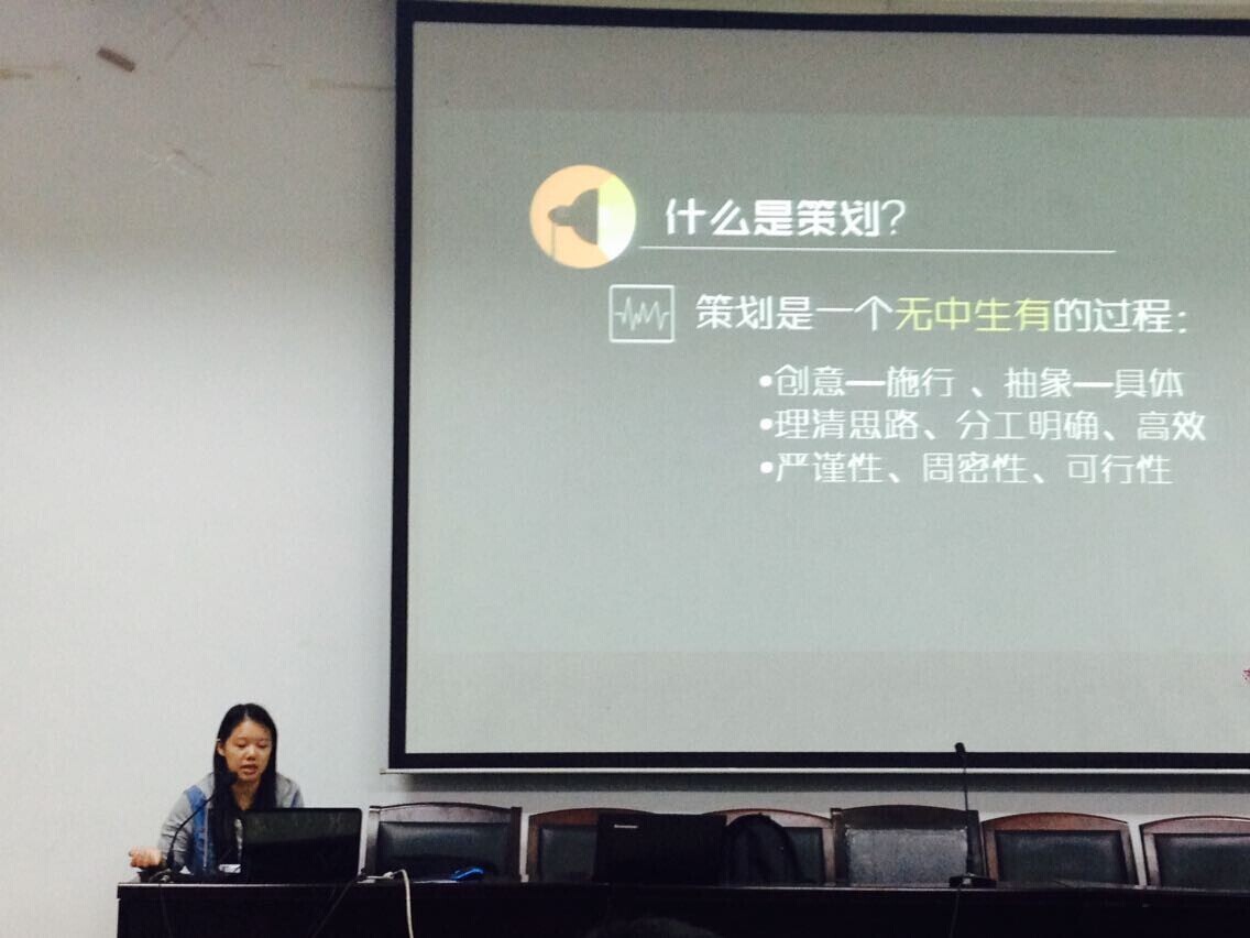 实践部部长顾笑聪主要说到怎样才能做好策划的问题,顺带提到不卑不亢是外联人所需要的一种素质。