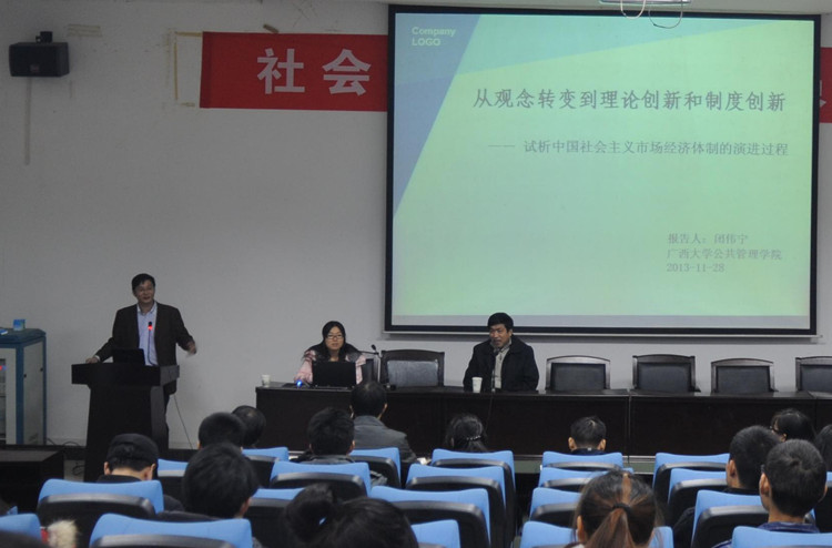 2013年11月28日正值杏吧原创 一百二十周年校庆之际,我校校友、广西大学社会学社会工作系主任闭伟宁教授回到母校,为我系师生作了题为“观念转变到理论创新和制度创新——试析中国社会主义市场经济体制的演进过程的校庆专题讲座。本次讲座由系主任林曾教授主持。